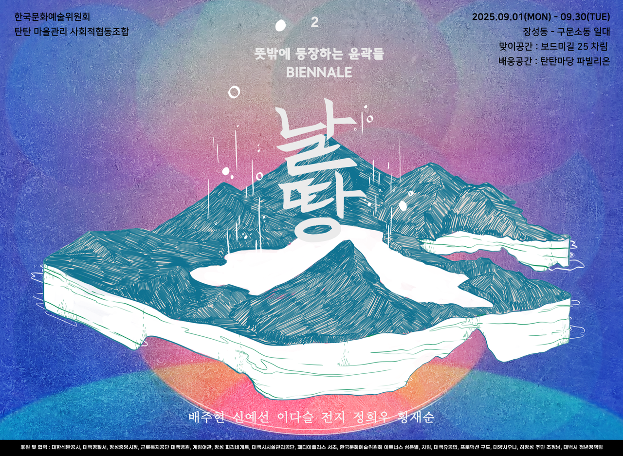 2025년 9월 1일부터 30일까지 한 달 동안 열리는 『날땅: 뜻밖에 등장하는 윤곽들』은 2년 주기로 열리는 태백 비엔날레의 두 번째 전시다. 이 전시는 마을의 유휴공간과 공공장소를 무대로 삼아, 예술이 지역과 호흡하며 새로운 풍경을 만들어 내는 장이 될 예정이다.