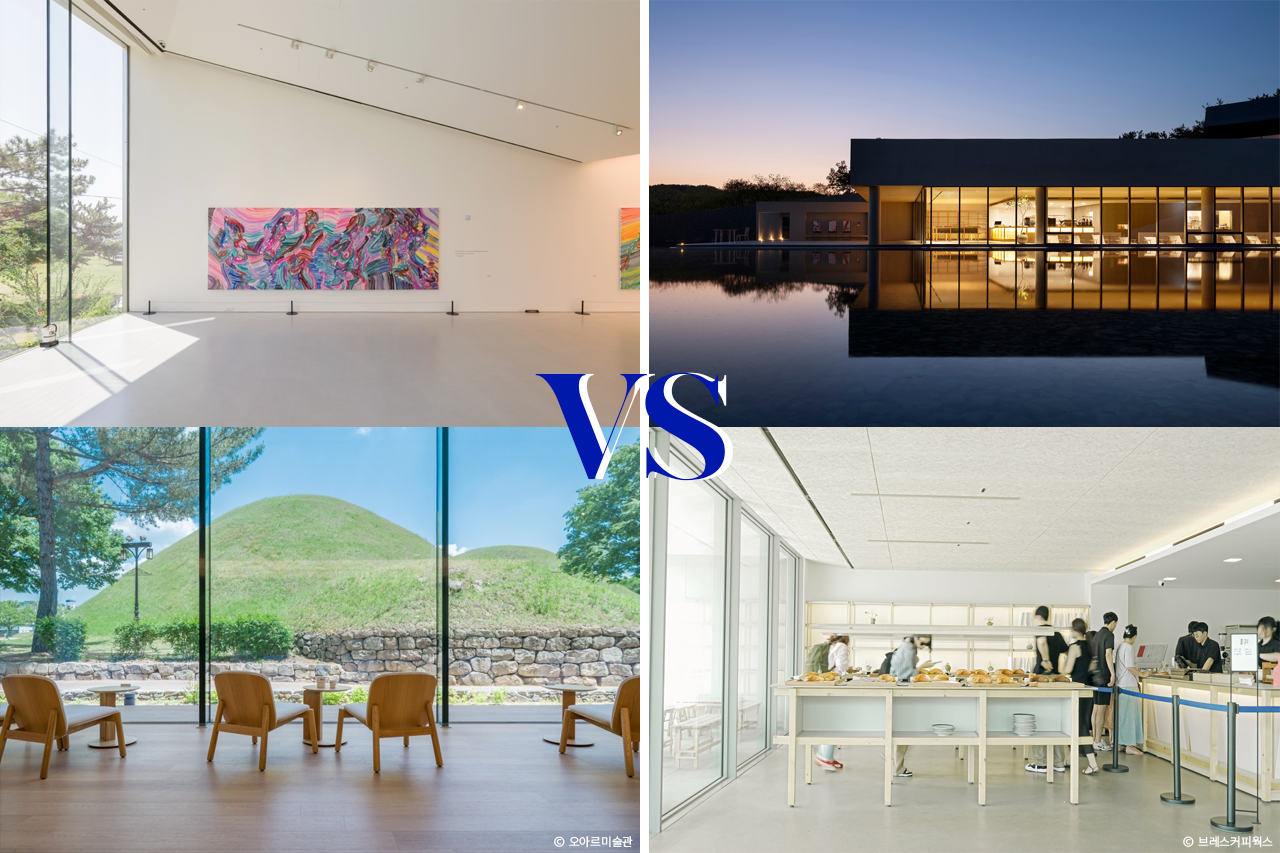 '오아르미술관(SNS)'은 유현준앤파트너스가 설계한 건물로 투명한 유리 파사드를 통해 고분과 자연을 실내로 받아들이며, 경주라는 장소의 전통적 풍경을 건축적 장면으로 재해석하는 것이 특징이에요. 관람객은 걷는 방향과 속도에 따라 끊임없이 달라지는 외부의 빛과 그림자를 경험하게 되고, 이는 전시 공간 자체를 하나의 예술적 시퀀스로 확장시키죠. 실제로 2025 한국건축가협회 건축상을 수상했고요.